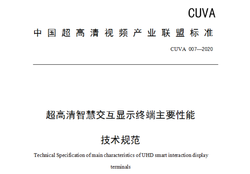 2020年11月26日,由中国电子正在上传...技术标准化研究院牵头制定的 CUVA 007-2020《超高清智慧交互显示终端主要性能技术规范》,经中国超高清视频产业联盟标准制定工作组广泛征求意见、讨论报批,现正式公开发布。